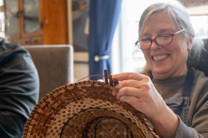 “They just don’t sell a cambium layer out of a tree,” Donna explains, holding a piece of cedar and pointing to a layer just past the outer bark. “That’s what’s used for weaving.”