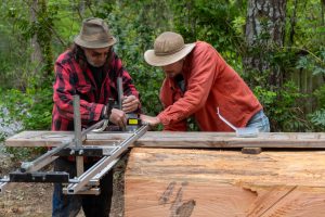 Robert (left) and Danial Harju (right) make long cuts along the log to rough out the same of the canoe.